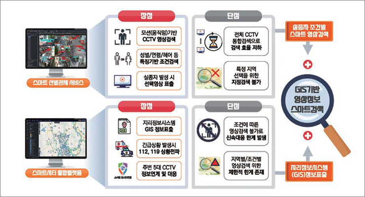 특히 2024년에는 기존에 운영 중이던 스마트선별관제(CS 버전) 서비스와 스마트시티 통합플랫폼(Web 버전) 기능을 융합, GIS 기반 CCTV 영상정보 스마트검색 서비스로 발전시켰다. 스마트선별관제 서비스는 CCTV 영상을 딥러닝으로 분석해 사람과 차량을 판별, 신속한 영상 검색을 지원하지만, 전체 CCTV를 대상으로만 통합 검색이 가능하고 특정 지역 지정검색은 불가능하다는 한계가 있었다. 반면 스마트시티 통합플랫폼은 사건 발생 시 관계 기관에 실시간 영상 정보를 전파할 수 있는 장점이 있으나, 개별 영상 검색 기능이 없어 실종자 추적 등 일부 대응에서는 별도 시스템을 이용해야 했다.