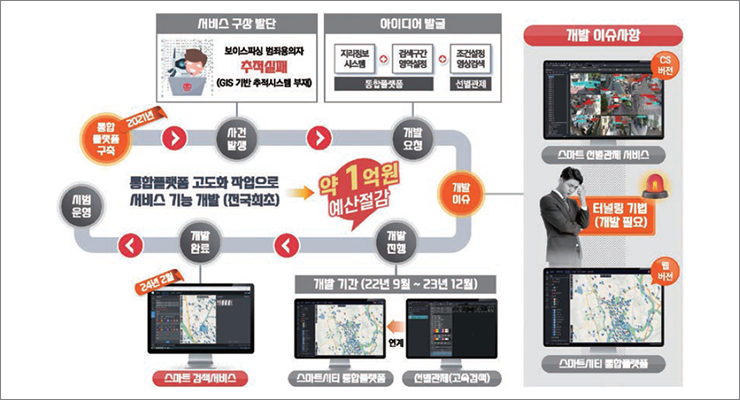 담당자는 먼저 GIS 기반 통합플랫폼에서 검색 구간을 직접 설정하고 조건에 맞는 인물이나 차량을 자동 탐색할 수 있는 시스템 아이디어를 구상했다. 이에 스마트 선별관제 서비스의 고속 영상 검색 기능과 스마트시티 통합플랫폼의 GIS 기반 서비스 기능을 융합하는 방식으로 개발을 추진했다. 약 1억 원의 예산을 투입하여 2022년 9월부터 2023년 12월까지 개발 기간을 거쳤고, 통합플랫폼 고도화 작업을 통해 GIS 기반 스마트 검색 기능을 전국 최초로 구현하는 데 성공했다.