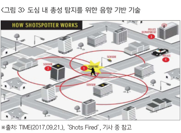 AI 기반 감지 기술은 기존의 시각 정보 중심에서 나아가 청각 정보를 함께 활용하는 방향으로 발전하고 있다. 총성, 비명, 고함 등 위험을 암시하는 소리를 실시간으로 인식함으로써 상황을 보다 정확하고 신속하게 파악할 수 있게 된 것이다. 주요 기술로는 Sound Event Detection, 음향 딥러닝 모델(CNN, RNN) 등이 있으며(Emre Cakir·Giambattista Parascandolo·Toni Heittola·Heikiki Huttunen·Tuomas Virtanen, 2017: 1) 일부 시스템은 영상과 음향을 통합적으로 분석하는 멀티모달 접근도 채택하고 있다(Junyu Gao·Maoguo Gong·Xuelong Li, 2015: 1). 이러한 기술은 어두운 밤, 골목, 주차장 등 CCTV 사각지대나 비가시 구간에서도 위협을 감지할 수 있어 감시의 공간적 범위를 넓혔다.