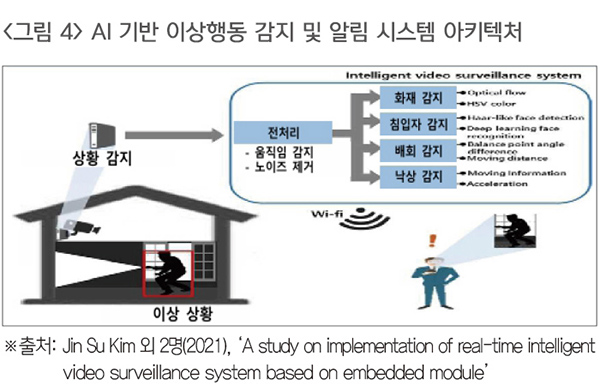 범죄 예방을 위한 AI 기술은 단순한 감지 기능을 넘어 분석 결과를 관제센터나 경찰, 보안 인력에게 실시간으로 전달하여 즉각적인 대응을 가능하게 하는 체계로 발전하고 있다. 주요 기술로는 IoT 기반 감지 장치, 실시간 알림 플랫폼, 모바일 경보 시스템 등이 있으며 긴급 상황 발생 시 분석 결과와 함께 영상, 위치 등 이벤트 정보가 자동 전송되어 빠른 출동과 초동 조치를 지원한다(S. Nithya Roseline·S Deepika·P Gayathri, 2025: 680). 이러한 연동 체계는 범죄 발생 징후를 조기에 감지하고 피해를 최소화할 수 있는 실시간 대응 기반의 시스템을 구현하는 데 핵심적인 역할을 수행하고 있다.