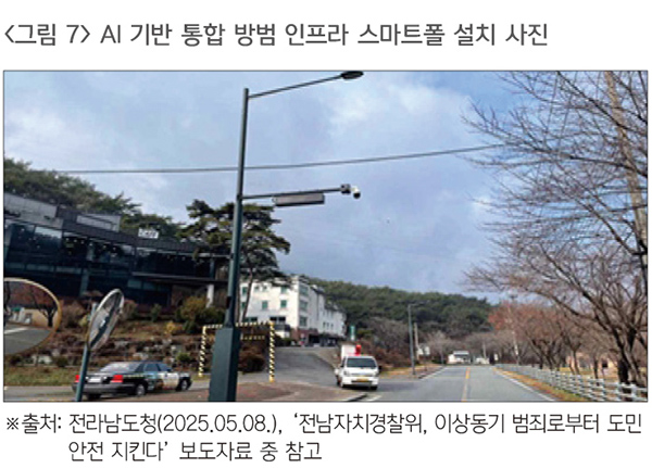 전라남도는 범죄 취약지역의 안전을 강화하고 도시 치안 인프라를 스마트하게 개선하기 위해 AI 기반 스마트폴 설치 사업을 추진하고 있다. 이 사업은 전라남도가 주도하고 도내 13개 시·군이 협력하는 형태로 각 지역의 골목길, 공원, 주택가 등에 지능형 CCTV, 조명, 비상벨, 각종 센서 등이 통합된 다기능 스마트 기둥(스마트폴)을 설치하는 방식으로 진행된다. 스마트폴에는 AI 영상 분석 기술이 적용되어 이상행동 감지, 군중 밀집도 분석, 화재 및 연기 감지 등이 가능하며 자치경찰 시스템과 실시간 연동되어 신속한 현장 대응과 선제적 범죄 예방을 지원한다. 또한 방범 기능 외에도 공공 와이파이 등 생활 편의 기능을 함께 제공함으로써 안전과 행정 서비스를 통합 제공하는 스마트 도시 인프라로 주목받고 있다(보안뉴스, 2024.07.30.).