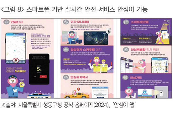 서울 성동구는 CCTV 사각지대에 대응하고 주민이 직접 안전 감시에 참여할 수 있도록 스마트폰 기반 범죄 예방 앱 ‘안심이’를 도입했다. 이 앱은 사용자가 위급 상황 발생 시 스마트폰을 흔들거나 음량 버튼을 누르는 등 간단한 동작으로 즉시 긴급신고를 할 수 있으며 사용자 위치와 함께 실시간 영상이 관제센터로 자동 전송되어 경찰 또는 관제 요원이 신속하게 출동할 수 있도록 지원한다. 특히 밤길 귀가 중에는 앱을 통해 모니터링을 요청할 수 있고 관제 요원이 사용자의 경로를 추적해 귀가 완료 시점까지 안전을 실시간 확인한다. 이 시스템은 기존 CCTV의 사각지대를 보완하고 주민의 자발적 참여를 통해 선제적 안전 대응 체계를 구축한 사례로 주목받고 있다(서울특별시, 2025.06.20.).