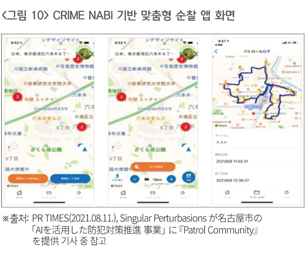 일본 나고야시는 고령화와 자율 방범 인력 감소 문제에 대응하기 위해 AI 기술을 활용한 지역 범죄 예방 시스템을 도입했다. 이 시스템은 CRIME NABI라는 AI 기반 범죄 예측 기술을 통해 과거 범죄 유형, 시간대 등의 데이터를 분석하여 위험 지역을 사전에 예측한다. 예측 결과는 Patrol Community 앱과 연계되어 최적의 순찰 경로를 자동으로 제시하며, 사용자가 이동수단과 거리 등을 입력하면 AI가 범죄 발생 가능성이 높은 지역을 중심으로 맞춤형 순찰 루트를 제공한다. 이를 통해 기존의 익숙한 순찰 동선에서 벗어나 효율적이고 선제적인 방범 활동이 가능하도록 유도하고 있다(Singular Perturbations).