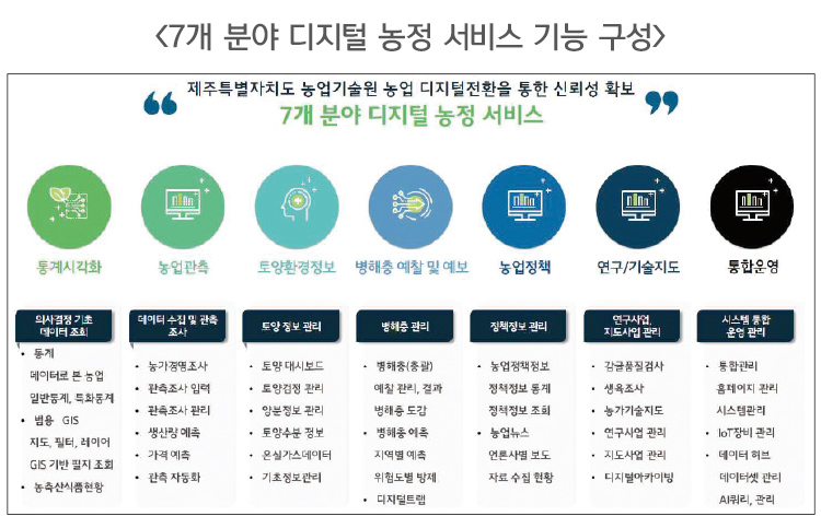 이를 기반으로 ▲통계 시각화 ▲AI 기반 농업관측(감귤·당근 생산량·가격 예측) ▲토양환경 분석 ▲병해충 예찰·예보(500m 단위) ▲농업정책(55개 기관 지원사업 스크랩핑) ▲연구·기술지도(RAG 기반 업무도우미·지식검색) ▲통합 운영관리 등 7개 디지털 농정서비스를 개발했다.