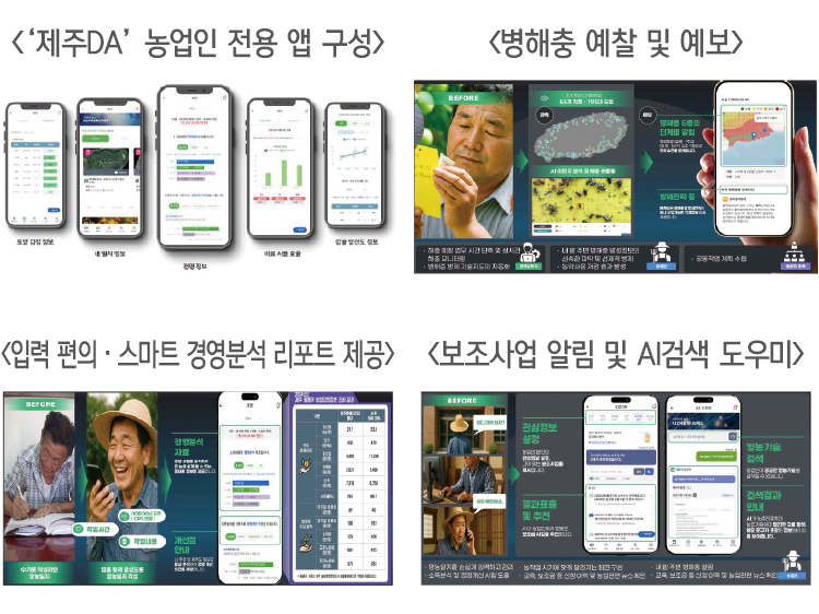 ‘제주DA’ 플랫폼은 정책부서, 관계기관, 생산자단체, 농업인 등 다양한 주체가 하나의 데이터 기반 위에서 실시간으로 협업하도록 설계돼 있다. 행정은 통합 데이터허브로 축적된 정보를 기반으로 정책 설계, 병해충 예보, 예산 지원 등 주요 의사결정을 신속하게 수행하고, 결과를 즉시 농업인에게 공유한다. 농업인은 앱을 통해 농작업 기록, 병해충 발생 현황, 품질검사 결과 등을 실시간으로 확인할 수 있으며, 자신이 입력한 필지 단위 데이터는 플랫폼으로 연계돼 분석된 후 다시 개인 맞춤형 정보로 되돌아온다. 생산자단체 역시 AI 기반 생산량·가격 예측을 활용해 적정 생산계획을 조정하고, 수급 관리 전략을 세우며, 현장과 행정 간 정책 정합성을 더욱 높이고 있다.