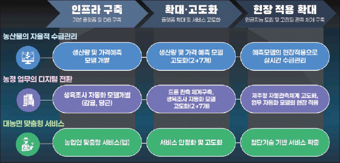 3단계(2027~2029년)에서는 그동안 축적·고도화된 분석·예측 기능을 농정 정책 전반에 내재화하여 현장 기반의 자율형 농정 체계로 확산하는 것을 목표로 한다. 데이터 분석 결과가 정책 설계, 유통·수급계획, 기후대응 전략 등에 자동 반영되는 구조를 구축함으로써, 농업인의 의사결정과 행정 프로세스 모두가 데이터 기반으로 전환되는 지속가능한 디지털 농정모델을 만들어갈 예정이다.