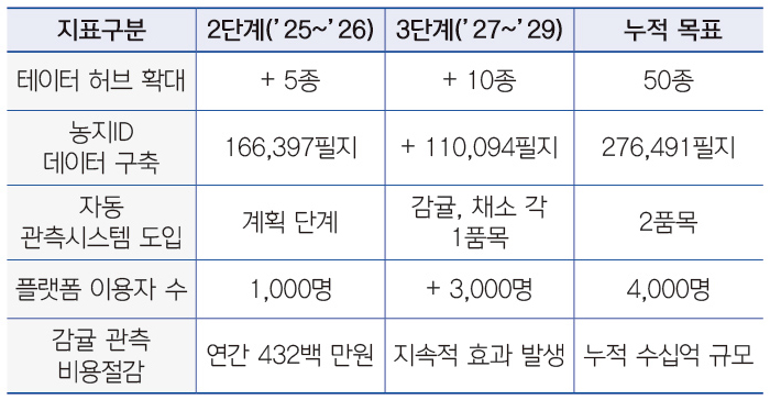2단계(2025~2026년)에서는 플랫폼에 축적된 방대한 데이터베이스(DB)를 활용해 관측 자동화 범위를 확대하고, 예측모델의 정밀도·신뢰도를 강화하는 데 주력한다. 이를 기반으로 작물별 정밀진단, 지역별 맞춤형 분석 서비스 등 현장 친화적 영농지원 기능을 확보해 실질적인 농업 경쟁력 향상을 지원할 계획이다.