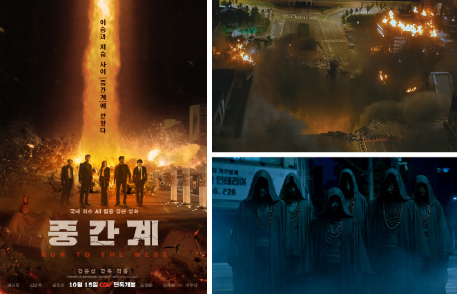 국내 첫 AI 장편영화가 스크린에 올랐다. 강윤성 감독이 AI 연출자 권한슬 감독과 협업해 완성한 〈중간계〉는 생과 사의 경계를 배경으로 한 판타지 액션 블록버스터다. CG와 크리처 작업 전반에 AI 기술을 도입해 제작 기간을 절반이하로 줄이며, 인간의 감각과 인공지능의 효율이 공존하는 새로운 창작 실험의 무대를 열었다.