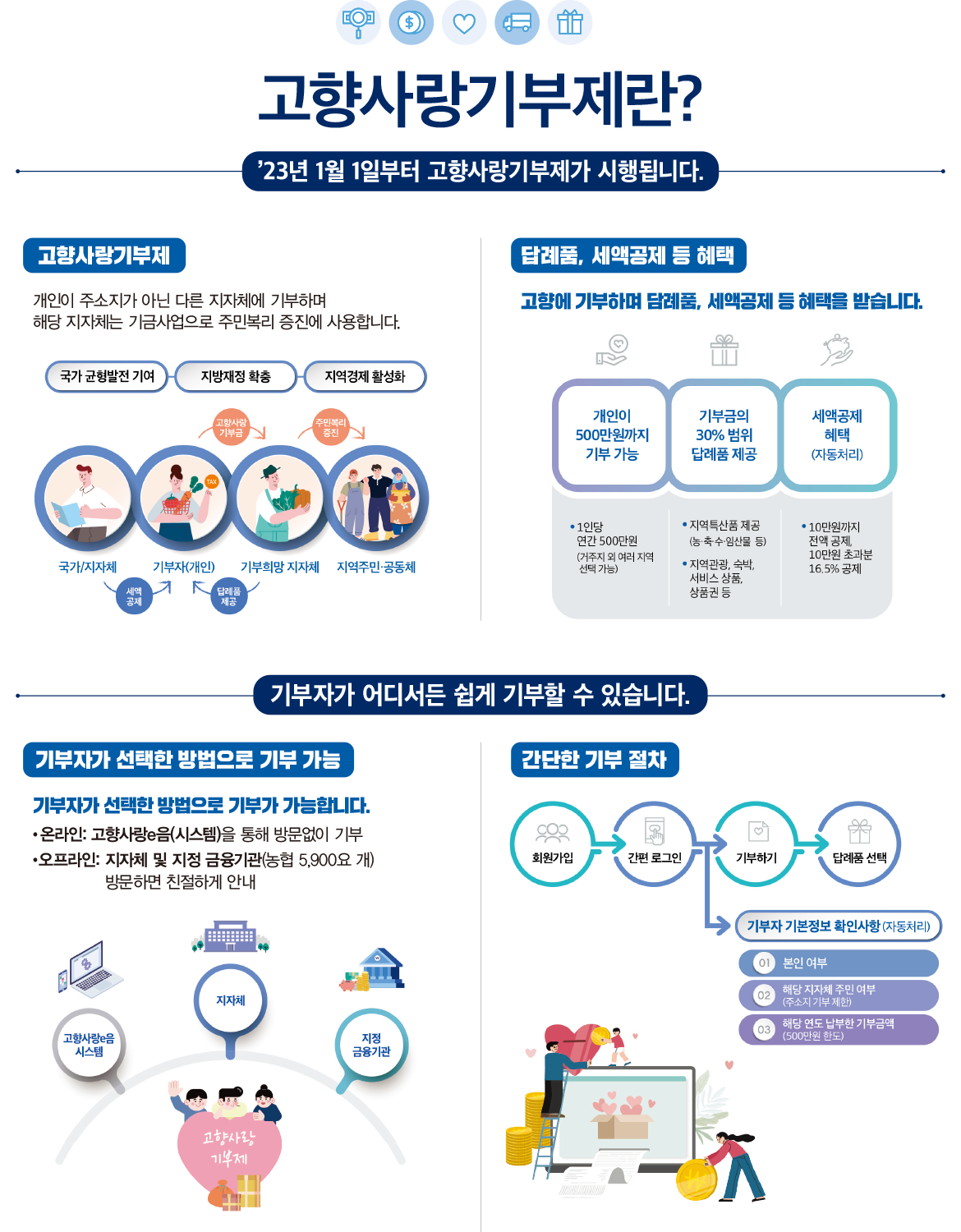 2023년 1월 1일부터 시행하는 고향사랑 기부제 고향에 기부하면 혜택을 돌려받는 고향사랑 기부제 더 큰 지역발전으로 보답하겠습니다.