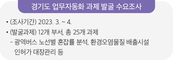 행정안전부에서는 국정과제, 정부혁신 방향을 담은 「공공부문의 일하는 방식 개선 종합계획」(’23.4월)을 통해 일하는 방식 개선 추진 방향을 제시하였고, 기존 관례대로 하던 업무수행 방식에서 벗어나 행정 효율성을 높이고 속도감 있는 행정 구현을 위해 일하는 방식 혁신 추진을 위한 「2024년 행정기관의 일하는 방식 및 조직문화 개선 추진계획」을 수립했다. 경기도 정부의 일하는 방식 개선 및 행정효율화를 위한 업무자동화 도입을 위해 전 부서 대상으로 업무자동화 과제 수요조사 등을 통해 적극적으로 과제 발굴을 추진한 결과 광역버스 노선별 혼잡률 분석 등 25개 과제를 발굴했다.