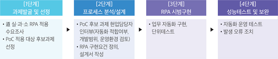 수요조사를 통해 과제 중 하나로 선정된 광역버스 노선별 혼잡률 분석 도입 검토를 위한 성능검증(POC)을 2023년 실시, 현업 담당자 인터뷰, 업무프로세스 분석·재설계를 통한 RPA 적합여부 검증, 향후 도입 시 검토사항 도출 등 업무자동화 효용성 및 도입 가능 여부를 검증했다.