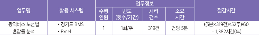 광역버스 노선별 혼잡률 분석 성능검증(POC) 적용 결과 단순 반복 업무(‘노선별 재차인원 다운로드 → 엑셀 가공, 피벗 생성’ 총 319회 반복)를 RPA 수행함으로써 기존 연 1,382시간 절감이 가능한 것으로 나타났으며 업무처리 소요시간은 85% 단축되어 기존 주 26.5 시간에서 주 4시간으로 업무시간이 획기적으로 단축되는 것으로 나타났다.
