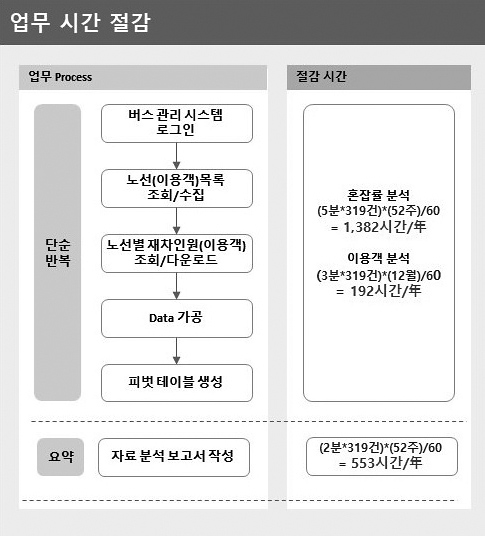 •노선별 재차인원 다운로드 → 엑셀 가공, 피벗 생성을 319회 단순 반복한 업무를 RPA 수행함으로써 연 2,127시간의 소요시간 절감 가능