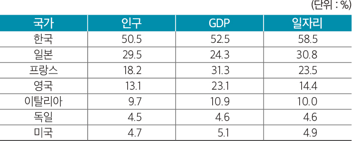※ 주 : 일본의 일자리 집중도 기준년도는 2021년, 영국의 일자리 집중도 기준년도는 2024년이다. 그 외 국가는 2022년 기준이다.