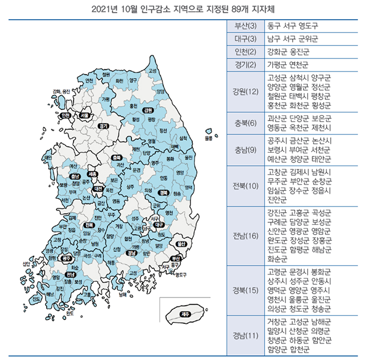 인구감소 지역은 행정안전부가 2021년 10월 11개 시·도 89개 기초지방자치단체(시·군·구)를 지정14)하였는데, 구체적으로 기초지방자치단체 지정 현황은 부산광역시 3개,