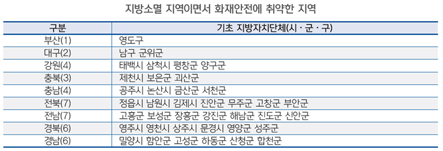 앞서 살펴본 인구감소 지역, 지방소멸 위험지역과 화재 취약 지역을 중첩 분석하면 상당수의 지방자치단체가 인구감소(지방소멸) 지역이면서 동시에 화재안전에 취약한 지역임을 확인할