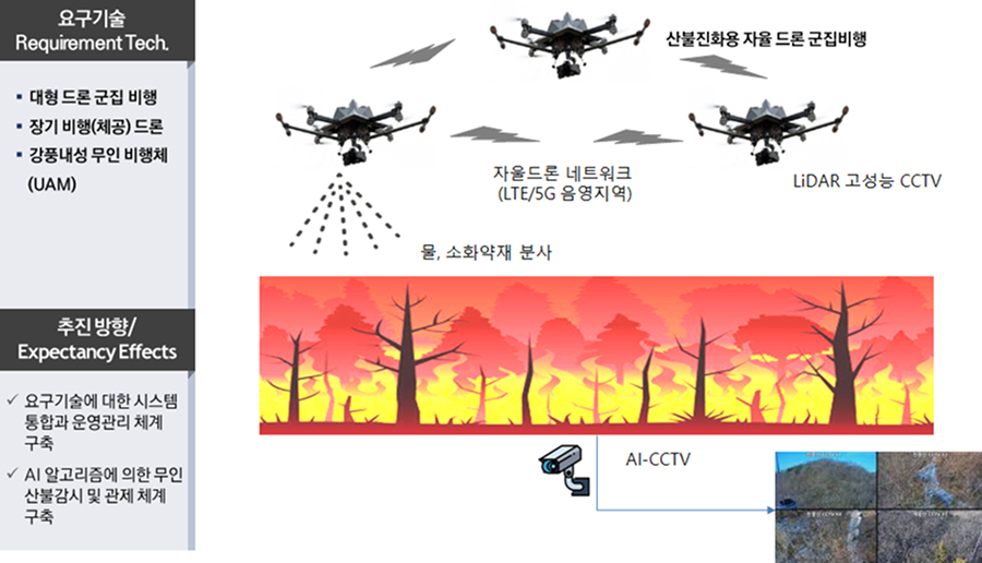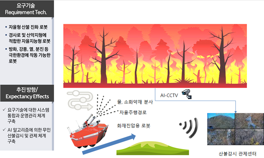 있는데 주요 내용은 웨어러블 산불진화 장비 개발, 산불진화 방재용 로봇 개발, 산불 진화 드론의 개발 등이 주요한 기술개발 내용이다.