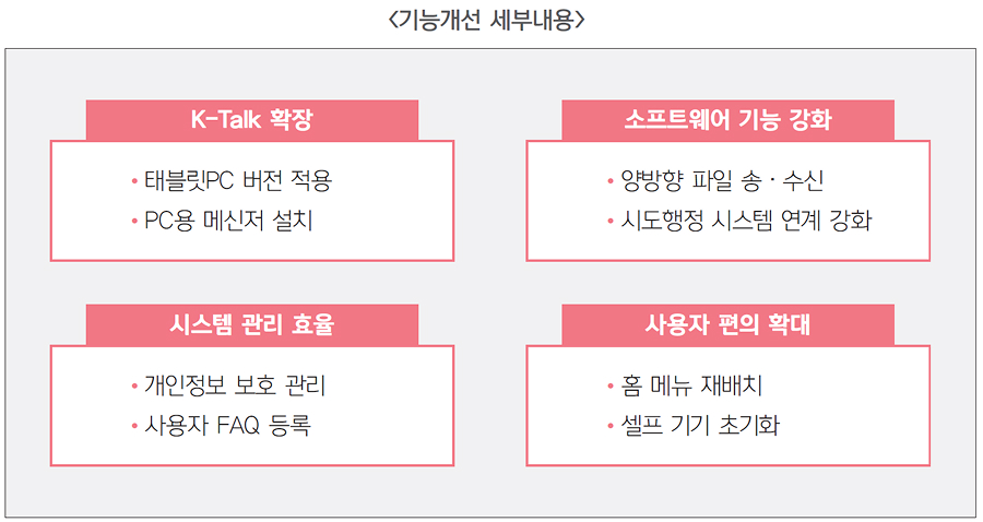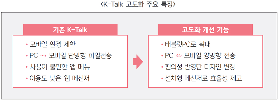 경상북도는 이러한 K-Talk의 고도화를 통해 행정의 유연성과 신속성을 확보하는 것은 물론, 민·관 협업체계 전반의 실질적 강화를 도모한다는 계획이다. 궁극적으로는 K-Talk가 단순한 행정 메신저를 넘어, 업무 연속성과 문제해결을 위한 실시간 협업플랫폼으로 자리매김할 것으로 기대하고 있다.